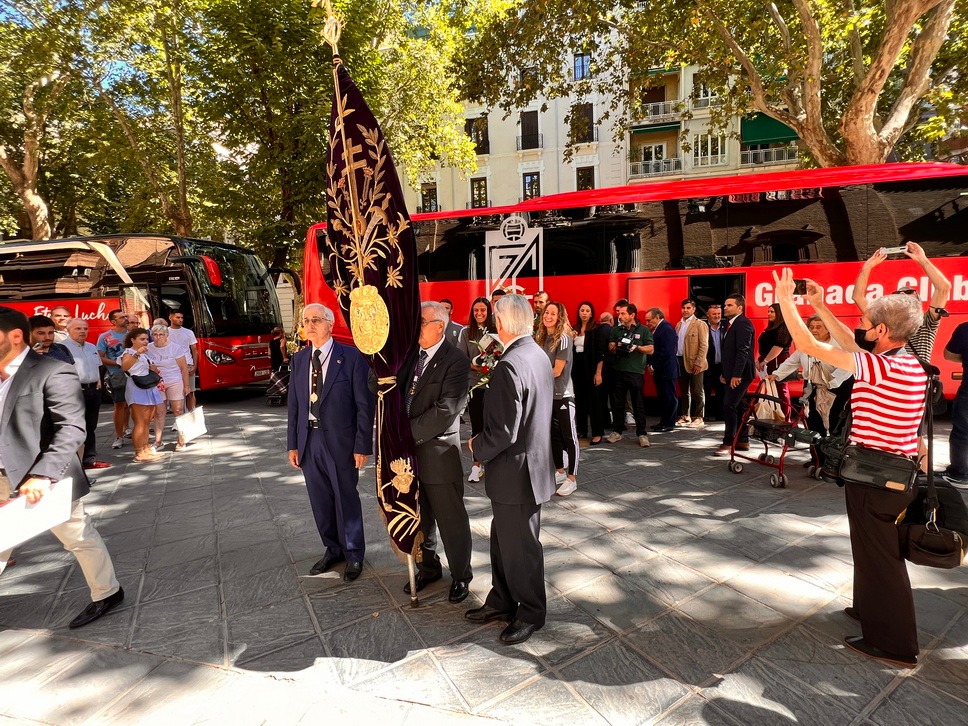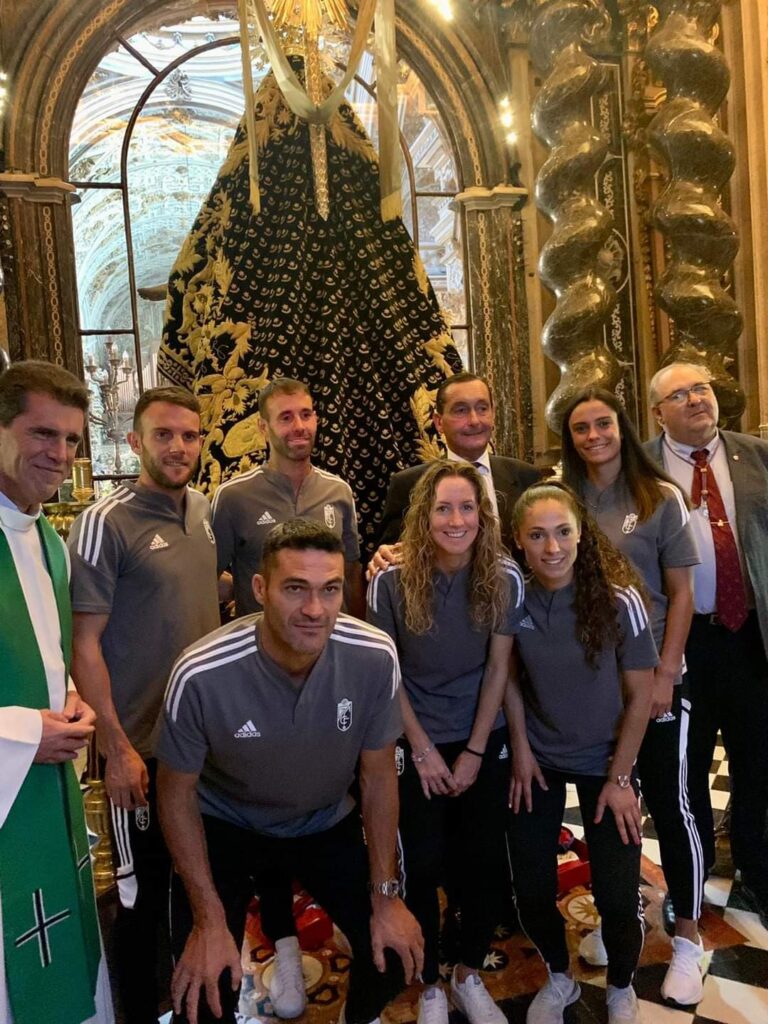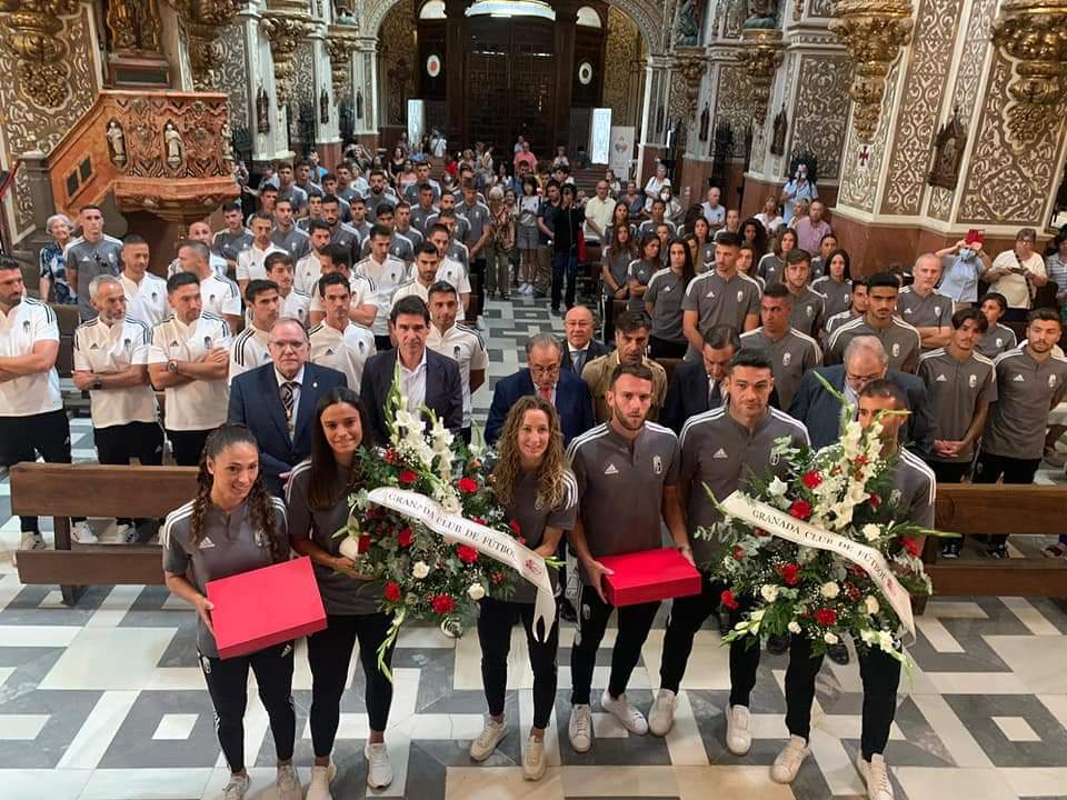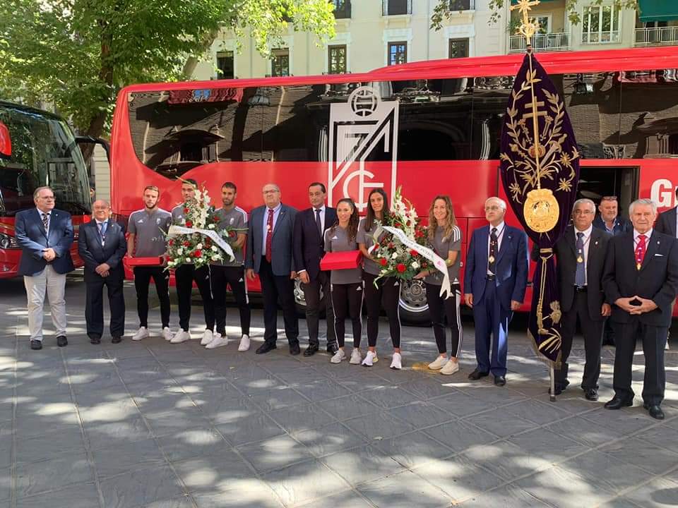 A las once y cuarenta y cinco minutos llegaban a las puertas de la Basílica de la Virgen de las Angustias dos autocares del Granada Club de Fútbol con todos los jugadores de la primera plantilla masculina y femenina, y representantes del Filial y del Fútbol Base, acompañados, en representación del Club, por D. Alfredo García Amado, Director General; Nico Rodríguez, Director Deportivo y Pepe Macanás.