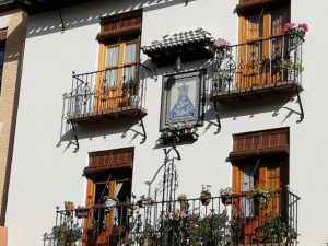 Carteles de la ofrenda que aún permanecen en las puertas y escaparates de algunas tiendas. Cuadros de Nuestra Madre presidiendo negocios y despachos. Azulejos en