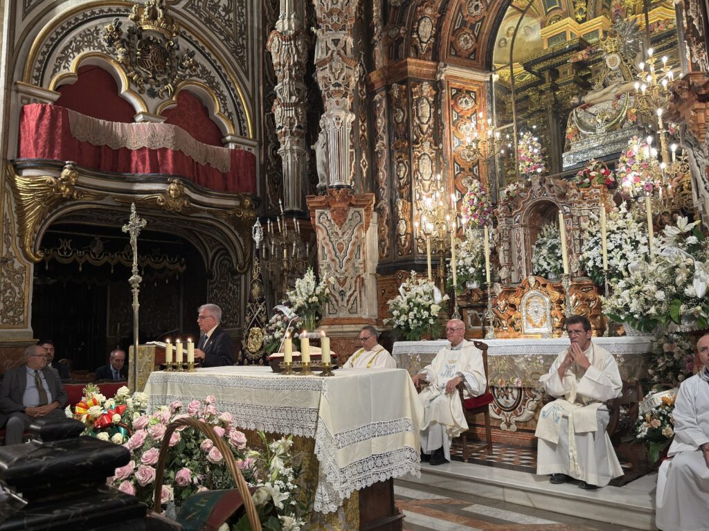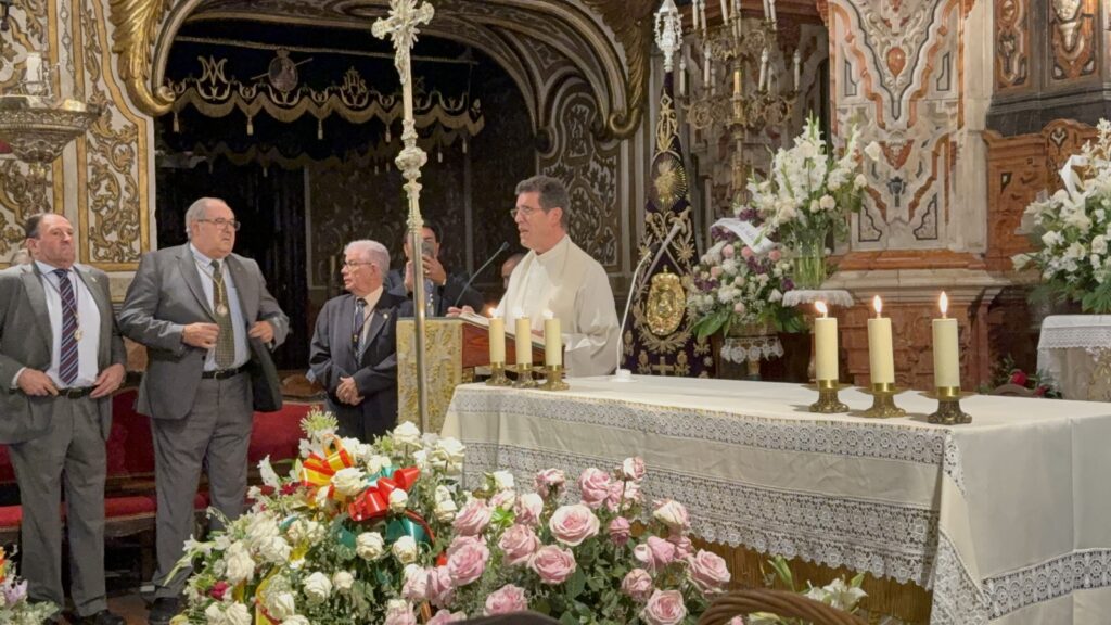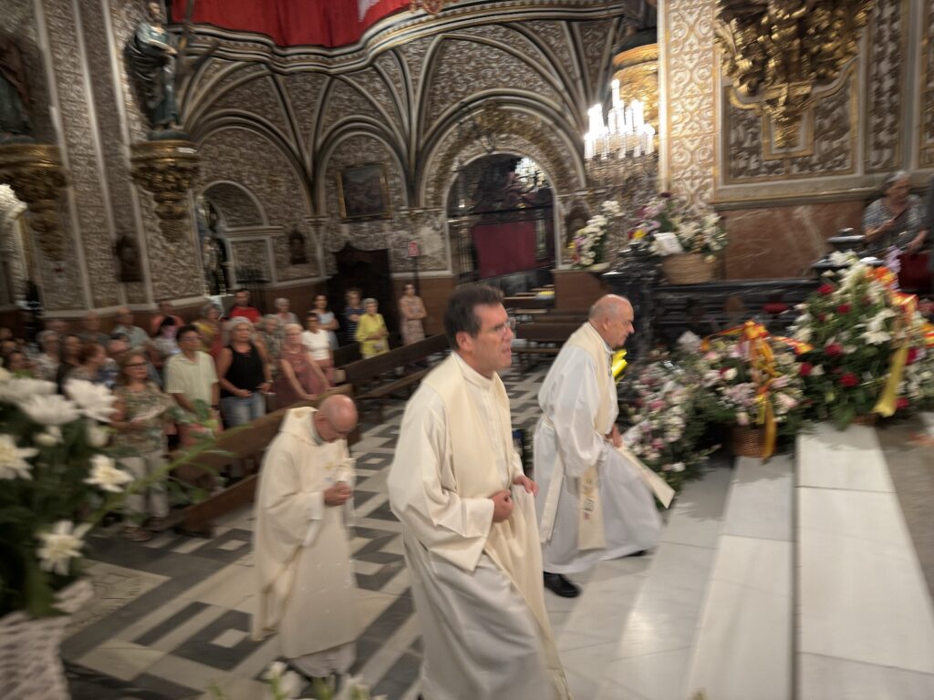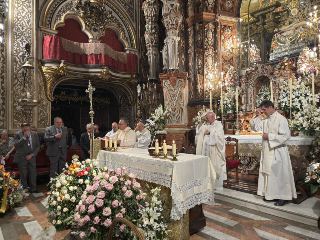 En su homilía D. Manuel, después de saludar a todos los presentes, expresó su agradecimiento, profundo tanto a la Hermandad como a la Parroquia, en la persona de su Párroco D. Blas, del que había sido compañero. Su homilía giró en torno a la parábola de los talentos, significando que la palabra talento es el conjunto de dones con los que una persona ejerce su oficio o profesión y que el Señor da los talentos a todas las personas y después cada uno los desarrolla según sus capacidades y voluntad en llevarlos a la práctica. Terminó su homilía con estas palabras “…El pecado nos lleva a enterrar muchas veces los talentos. La Virgen jamás enterró ningún talento; al contrario los multiplica siempre en favor tuyo y en favor nuestro”.