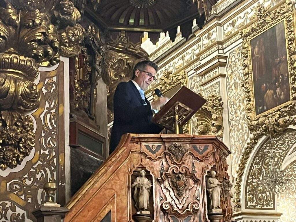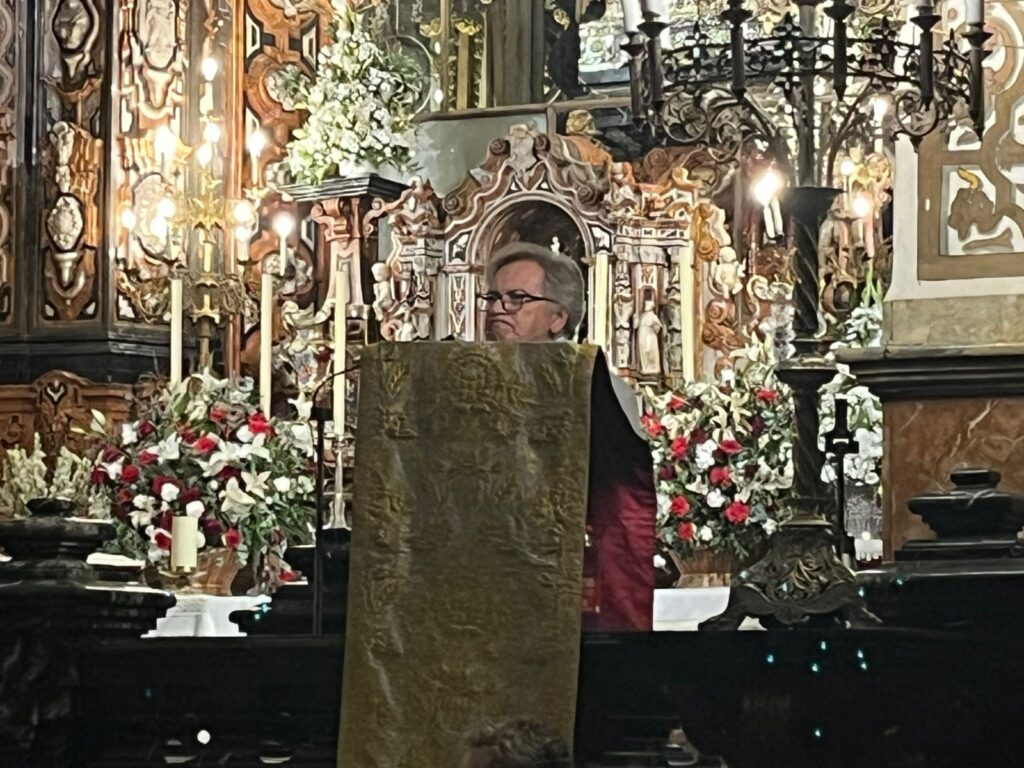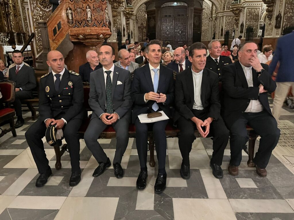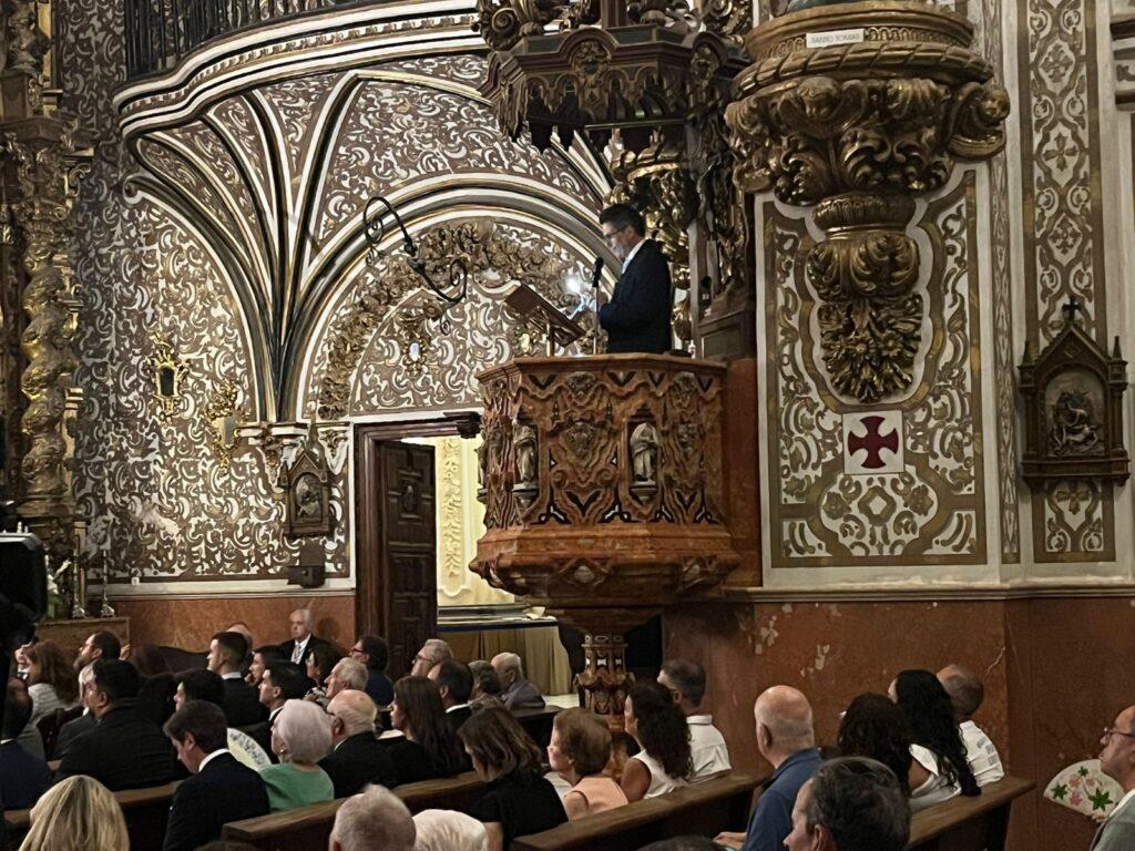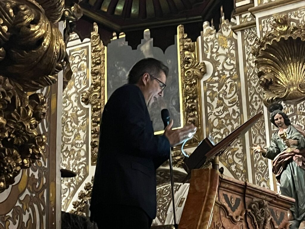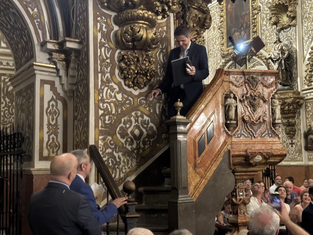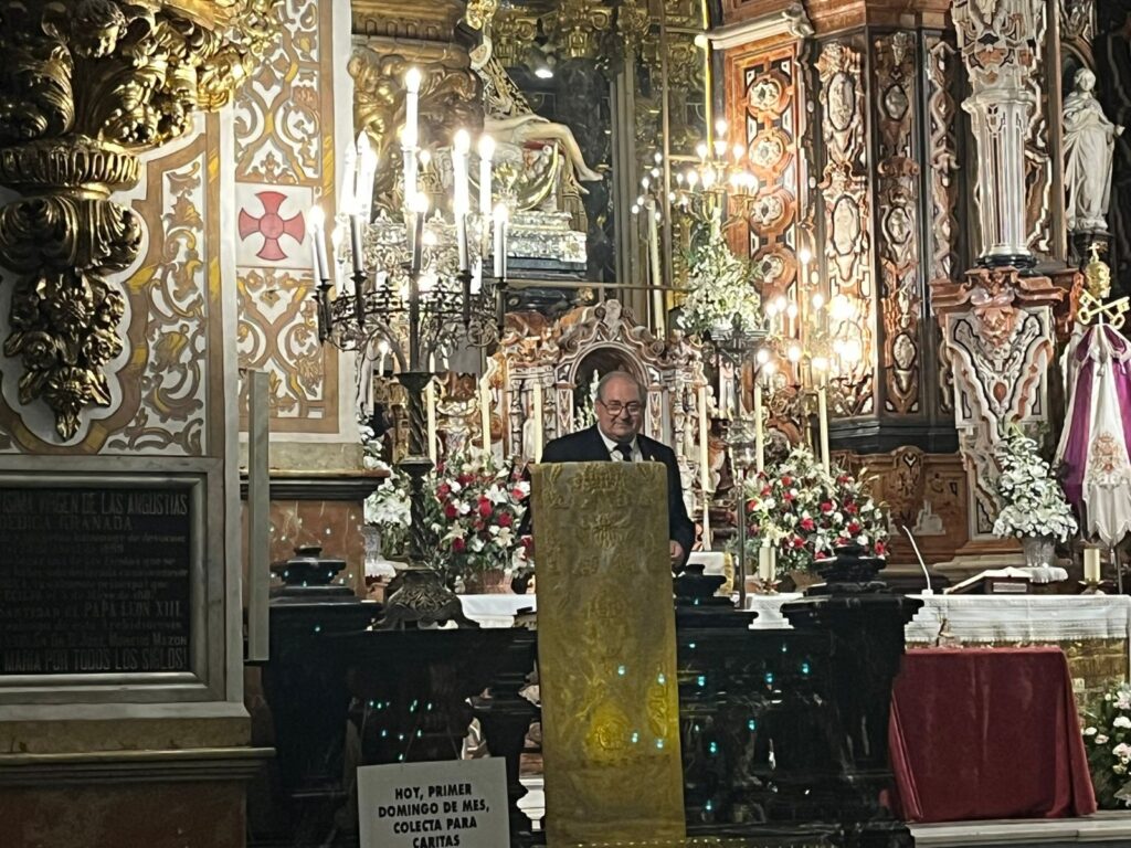 Después de subir al púlpito de la basílica, tomó la palabra Fernando que hizo una exaltación sobresaliente, que tocó sin duda el corazón de todos los que tuvieron la suerte de escucharlo. En primer lugar explicó cómo hay muchos motivos y porqués a la hora de acercarnos a la Virgen de las Angustias, en su caso la enfermedad, que se le inició en la víspera de Reyes de 2024 como él mismo relata: “Caminaba por Granada con Lucía, mi esposa y nuestros hijos: veníamos de ver la cabalgata desde el Puente Romano, pero en vez de seguir nuestra ruta a casa nos desviamos a la Basílica y al principio me asomé, como tantas veces, pero esta vez entré y quise quedarme. Y seguramente me quedé, me quedé para siempre. A la mañana siguiente, mañana de Reyes, no iba en una carroza-como disfruté un año antes- sino en una ambulancia”. A través de esta experiencia de fe y enfermedad la Virgen se convierte para él en luz, mirada, refugio y madre. A continuación expresó su gratitud a la Hermandad Sacramental de la Virgen de las Angustias, a su Hermano Mayor y a diversas personas que le ayudaron a preparar este acto. En segundo lugar recorre la historia, el arte y la espiritualidad de la Basílica y la Hermandad, mostrando cómo la devoción a la Patrona trasciende fronteras. Recuerda la labor social-atención a más de 1600 personas a través de la Fundación de su Obra Social. Evoca también la profunda conexión entre Granada y su Patrona a través de símbolos, obras de arte, mantos a los que define como “lienzos espirituales donde se ha bordado la historia de Granada”, y coronas donadas por el pueblo y la realeza. Recuerda episodios históricos como la coronación de 1913, el incendio de 1916 y la declaración como Patrona por León XIII en 1847.