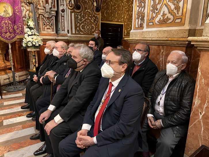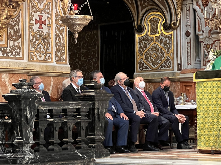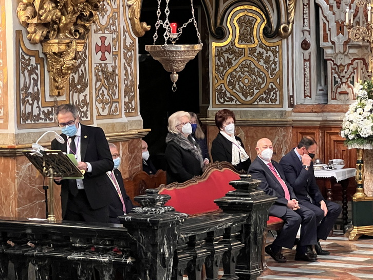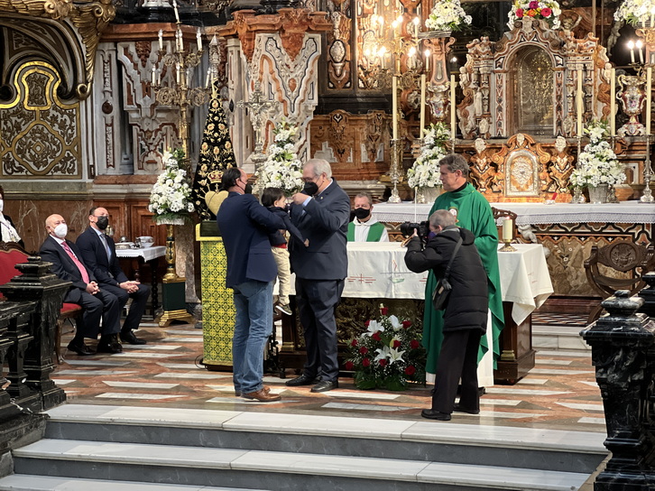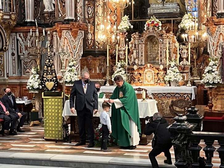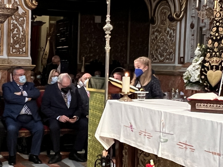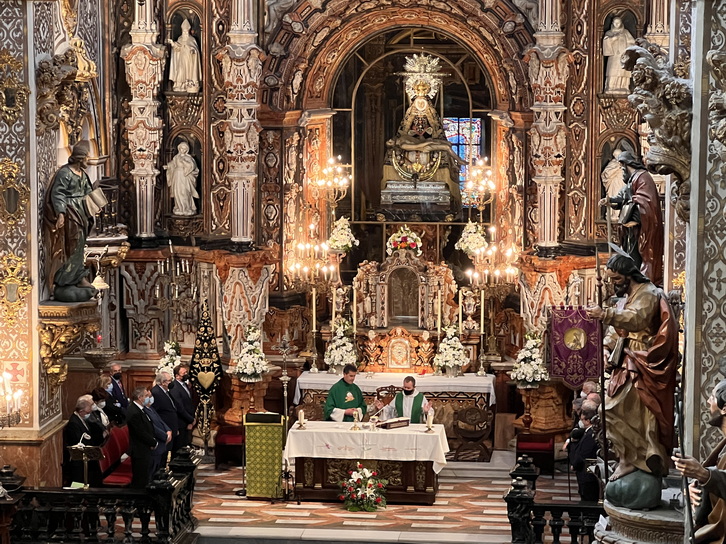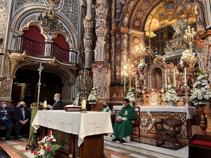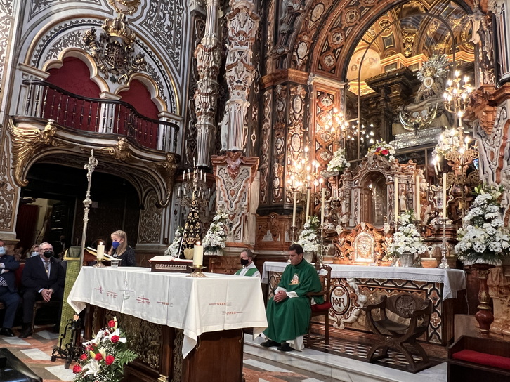 La Eucaristía se ha celebrado a las 12 del mediodía y ha sido presidida por D. Blas Gerardo Gordo Jiménez, Párroco de la Basílica, Vicario Episcopal de Pastoral y Consiliario de la Hermandad, acompañado por D. Miguel Teruel, Sacerdote de la Basílica. La Junta de Gobierno entrante de la Hermandad Patronal de la Virgen de las Angustias, junto con su Hermano Mayor D. Antonio González Martín ha ocupado el lateral izquierdo del altar mayor y la Junta saliente, con su Hermano Mayor, D. Miguel Luis López-Guadalupe Muñoz ha ocupado el lateral derecho acompañado del Hermano Mayor Honorario D. Francisco Salazar.