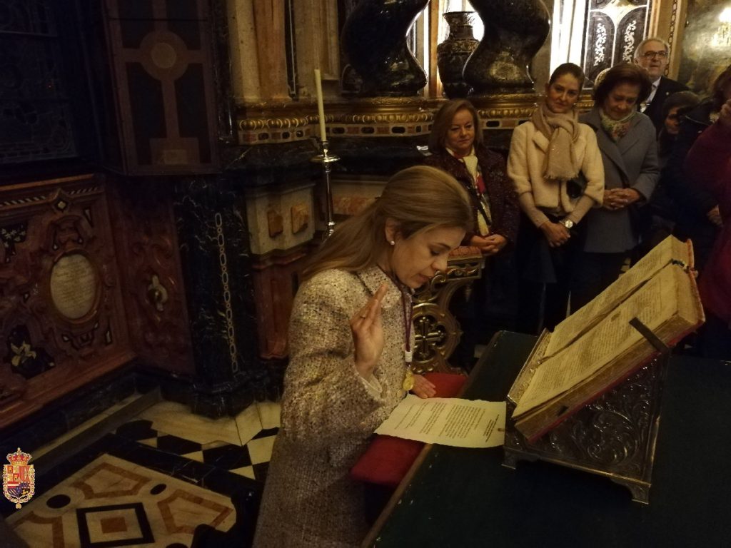 En la noche de ayer viernes y tras la Misa de Hermandad, nuestra hermana María Dolores Martínez Baca juró en el Camarín de la Santísima Virgen, su cargo como Camarera de Nuestra Madre. Se convierte así en una de las siete Hermanas que componen este cuerpo y que tienen el inmenso privilegio se ser las encargadas de la tarea de vestir a la Santísima Virgen.