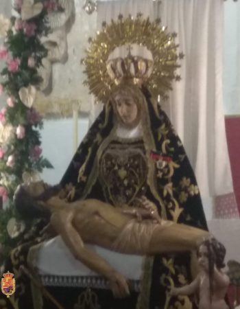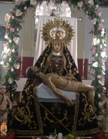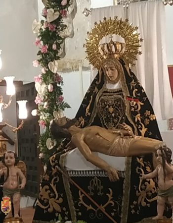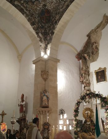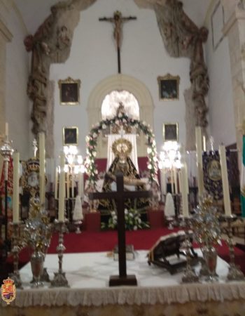 Magnífica decoración presentaba en el exterior y en el interior la iglesia del Carmen, presidida sobre un entarimado por la bendita imagen patronal de Nuestra Señora de las Angustias, que en este año cumple también sus 80 años, desde que saliera el taller de Espinosa Cuadros, para sustituir a la imagen destruida en 1936.