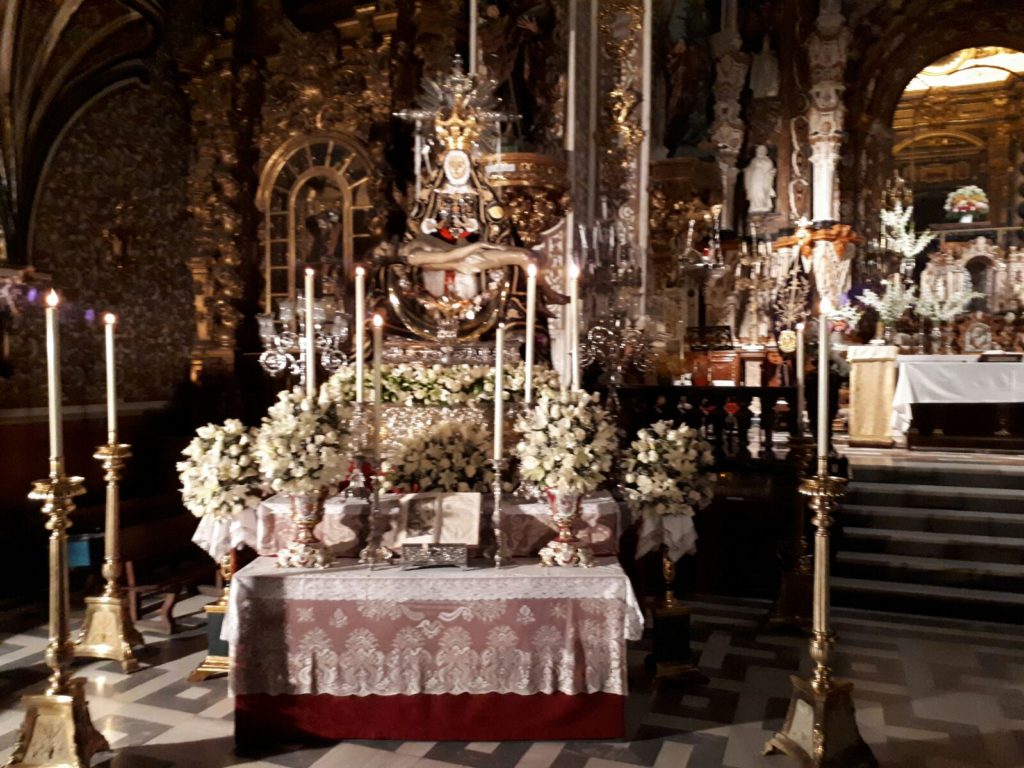 Comenzaremos el mes con la Santísima Virgen de las Angustias en el presbiterio de la Basílica. De esta forma permanecerá desde el día uno hasta el tres de mayo. Como es tradicional, lucirá el manto del Arte de la Seda (o de los gusanitos).