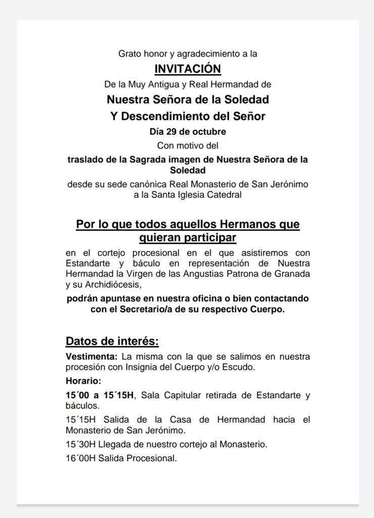 Por lo que la Hermandad invita a los hermanos de Nuestra Hermandad la Virgen de las Angustias Patrona de Granada y su Archidiócesis a participar en el cortejo procesional, asistiremos con Estandarte y báculos en representación. Los Hermanos y Hermanas Cofrades que quieran participar pueden apuntarse en la secretaría de la Hermandad el viernes 28 de octubre de 18:00 a 20:00 o contactando con el Secretario de cada cuerpo.