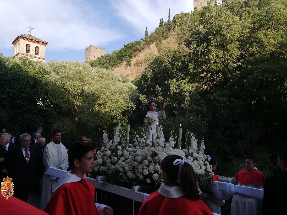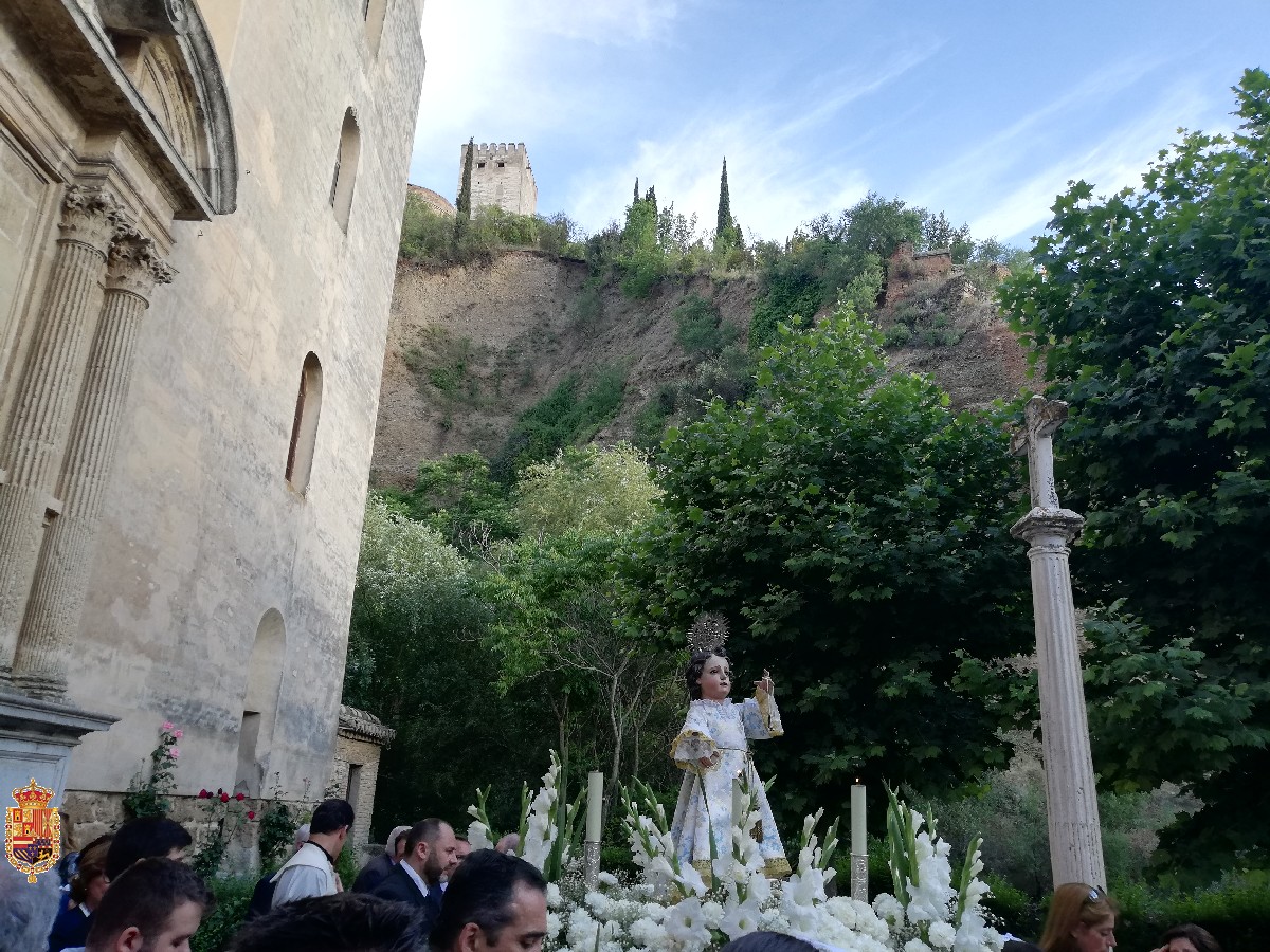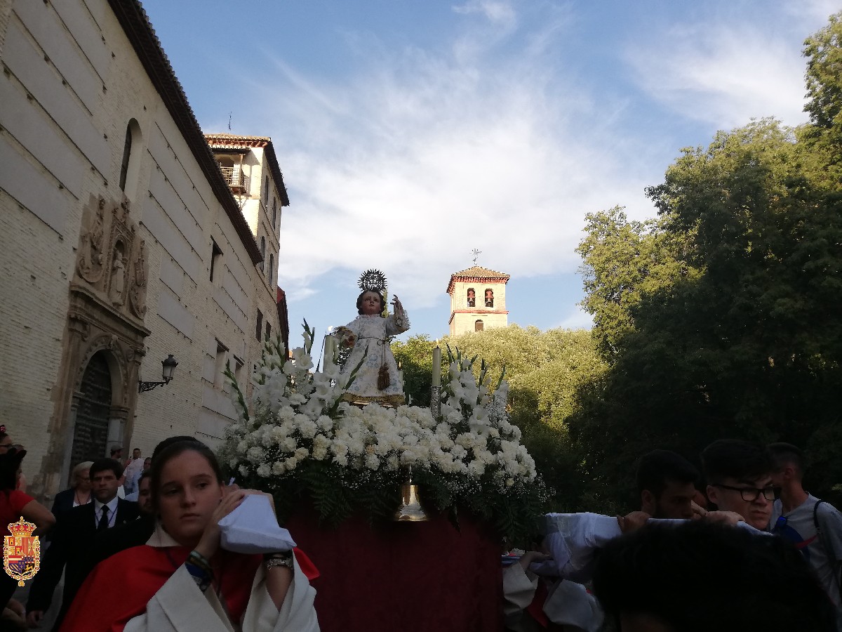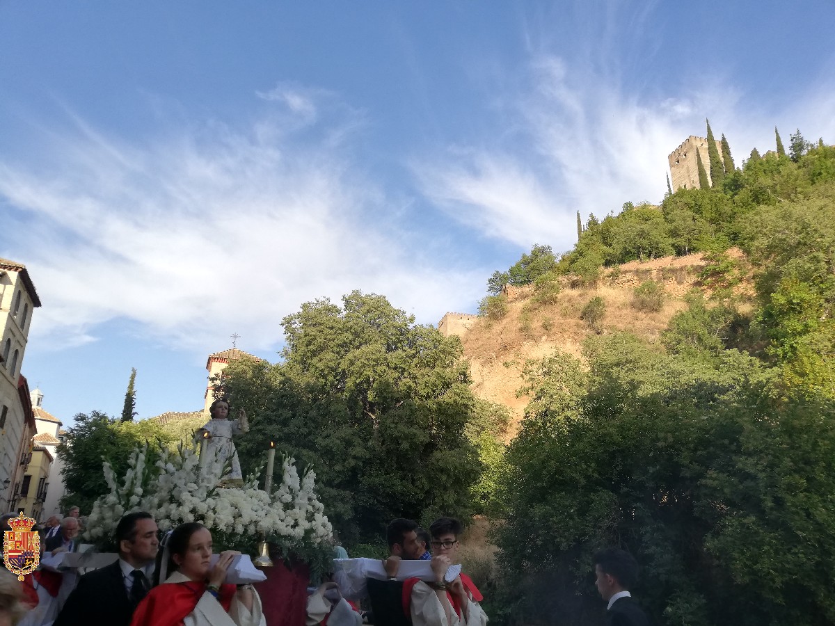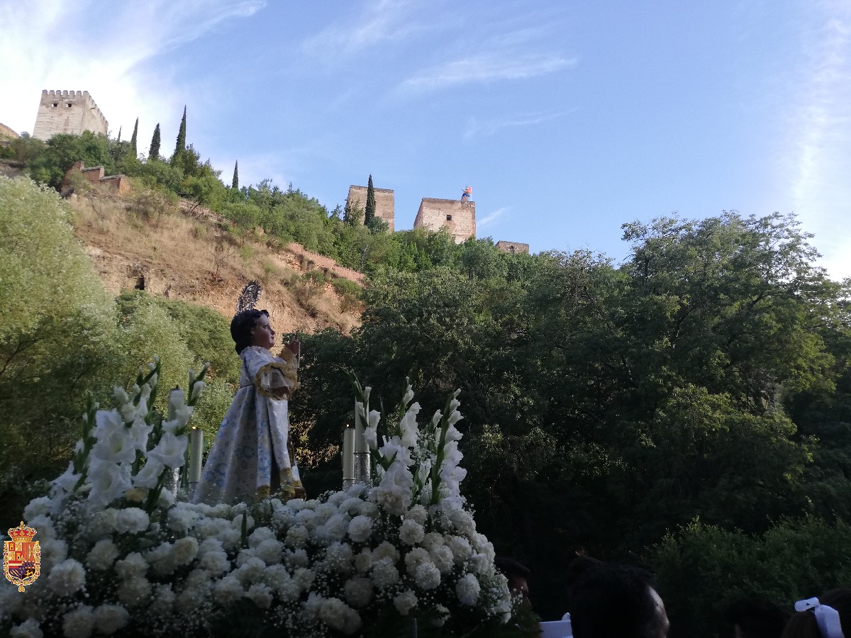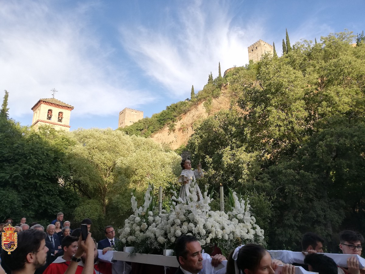 El regreso, nuevamente por Carrera del Darro, resultó de especial belleza con las torres de la Alhambra de maravilloso fondo de la Sagrada Imagen del Niño Dios.