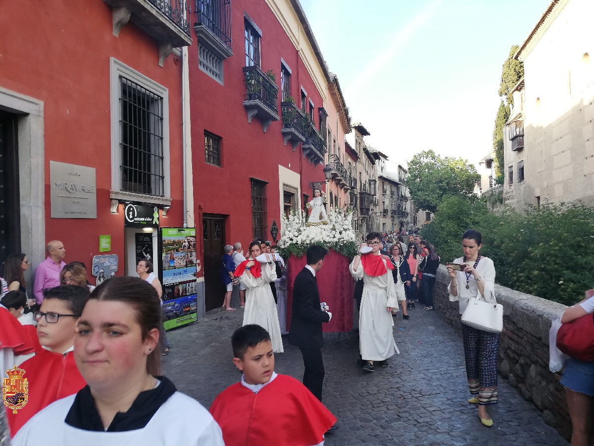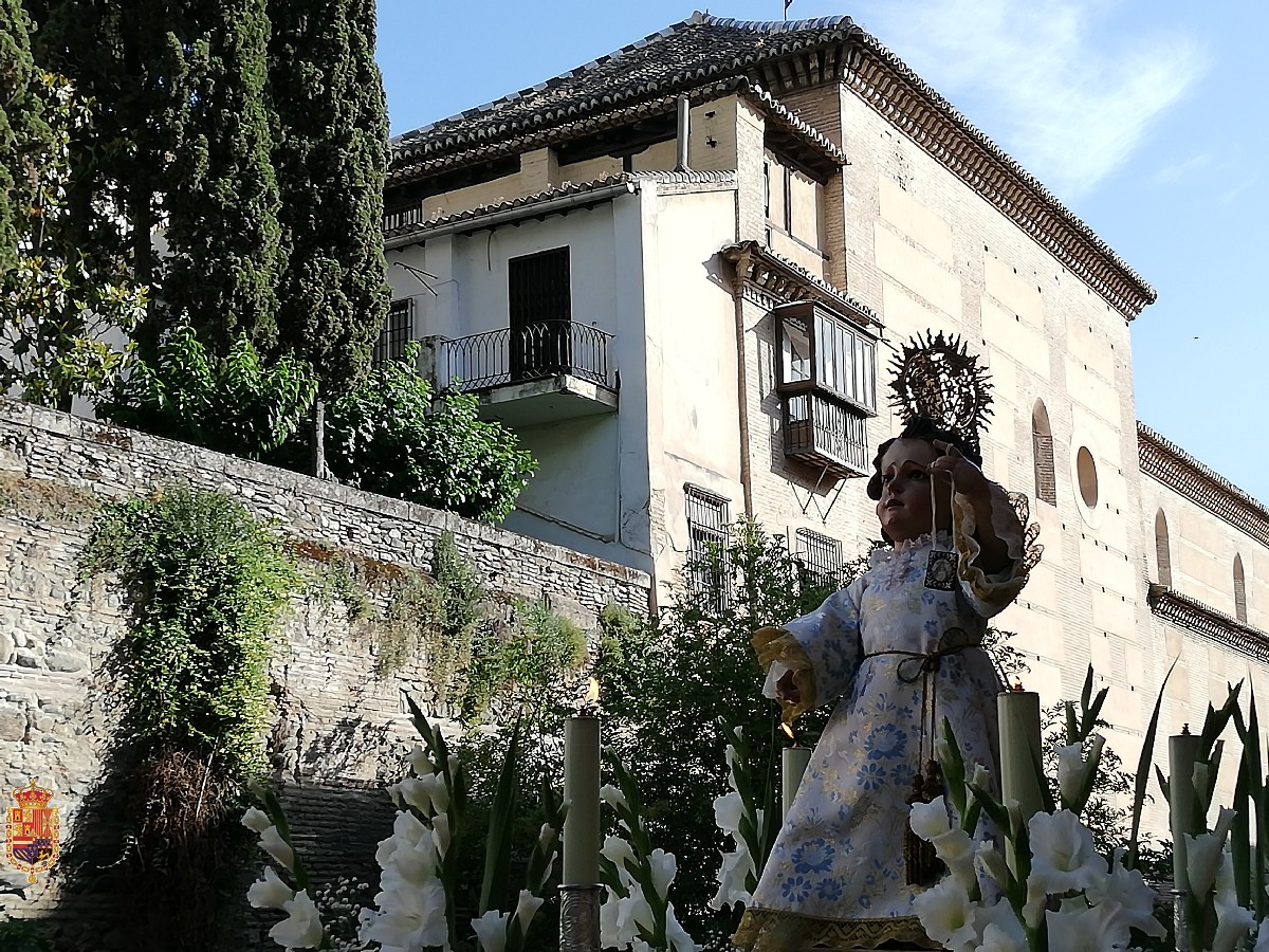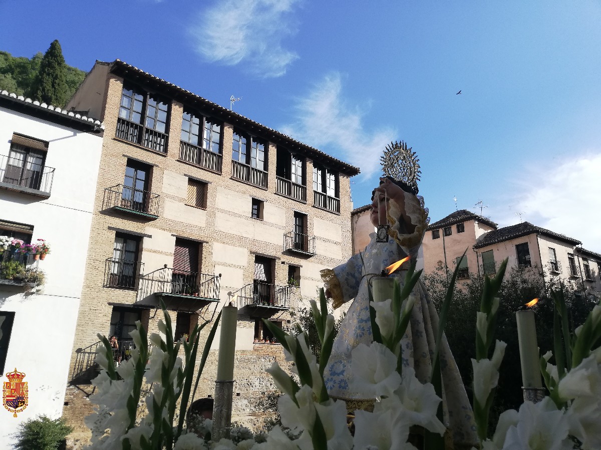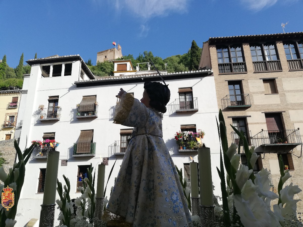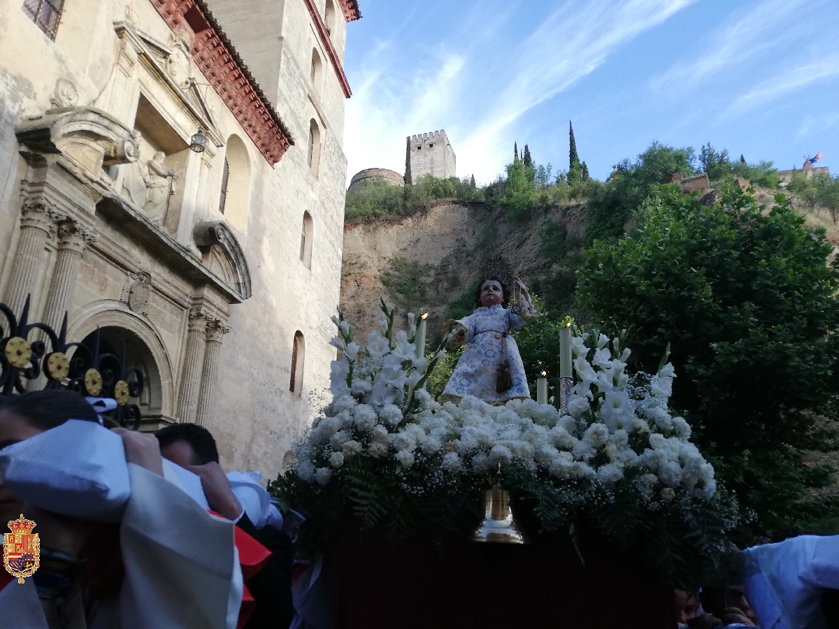 El regreso, nuevamente por Carrera del Darro, resultó de especial belleza con las torres de la Alhambra de maravilloso fondo de la Sagrada Imagen del Niño Dios.